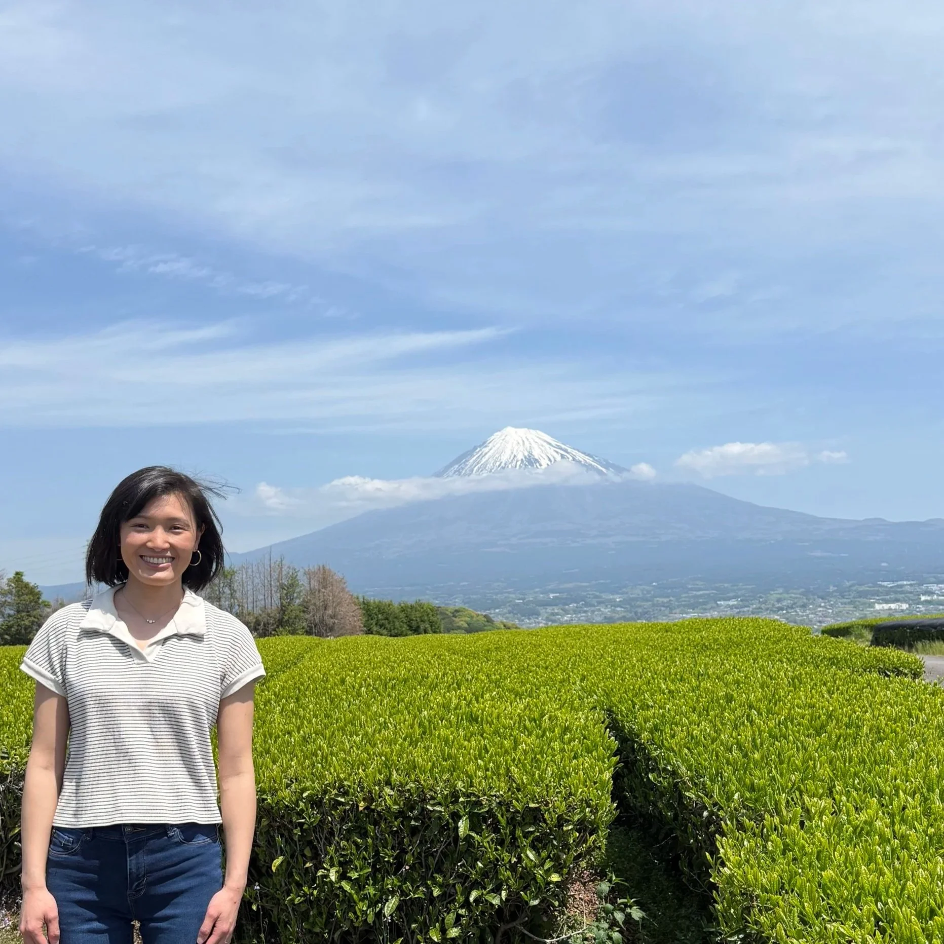 After the farm, Mr. Kobayashi drove us up a hillside. He said it was rare to see Mt. Fuji so clearly — the mountain is almost always hidden in cloud. That afternoon, it was entirely visible: a perfect cone above the tea fields.