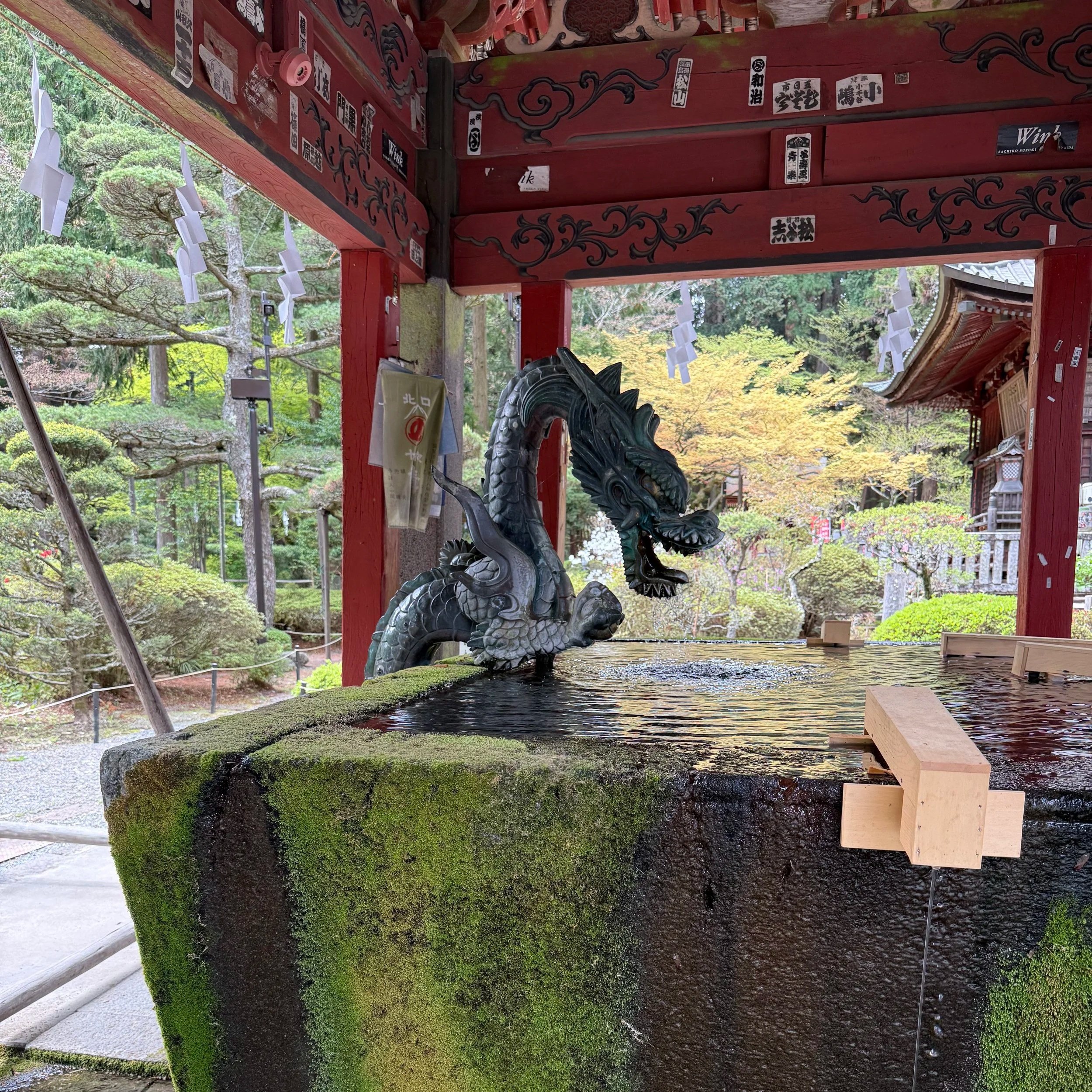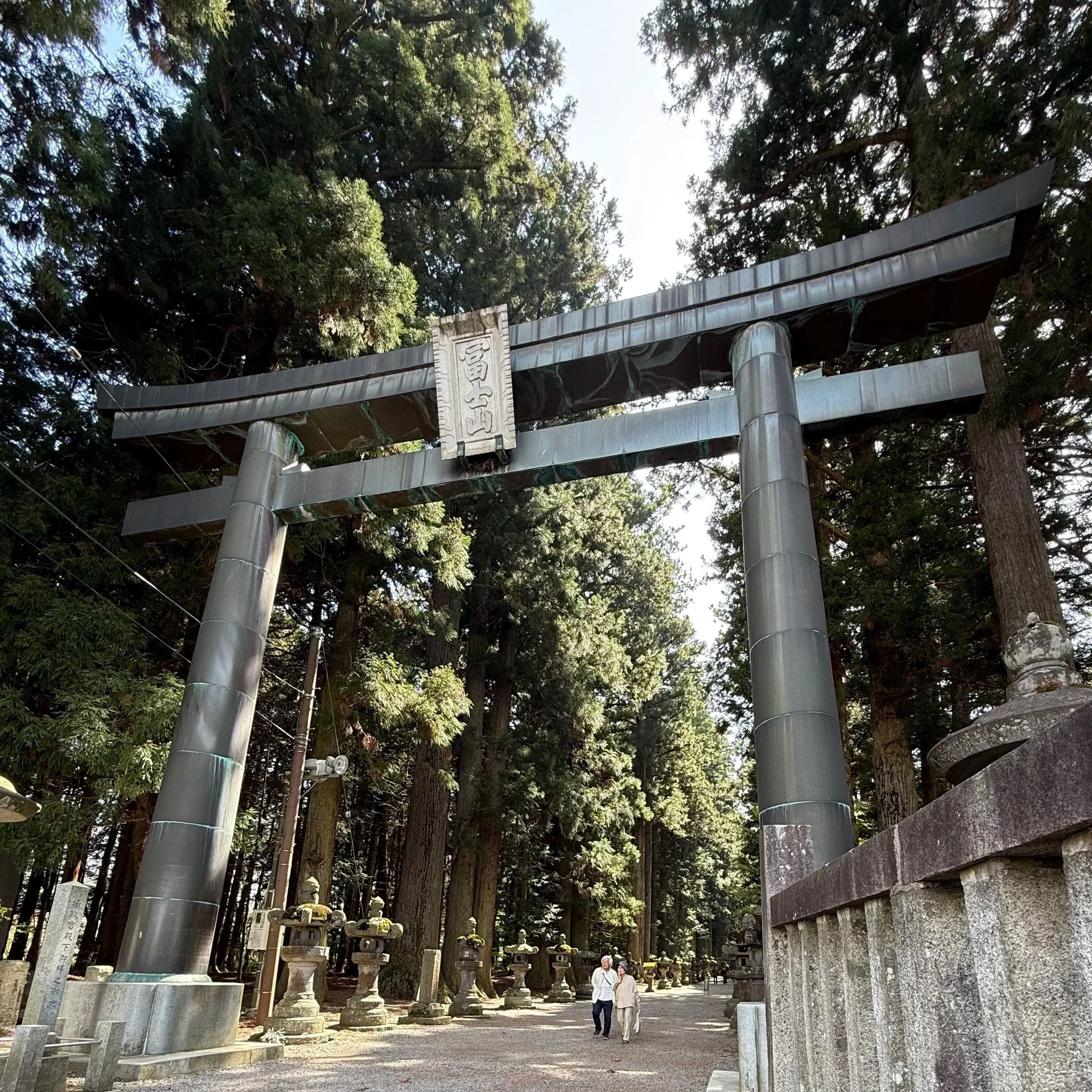 Our tour started at the Kitaguchi Sengen Shrine. He showed us the dragon carvings at the purification fountain — in ancient Japan, people believed dragons lived in water and caused thunder, so the dragon became the guardian of the sacred spring. He showed us the great Tengu mask inside the main hall — the mountain spirit of Japanese folklore, said to use magical powers to protect the pilgrims ascending to the summit.